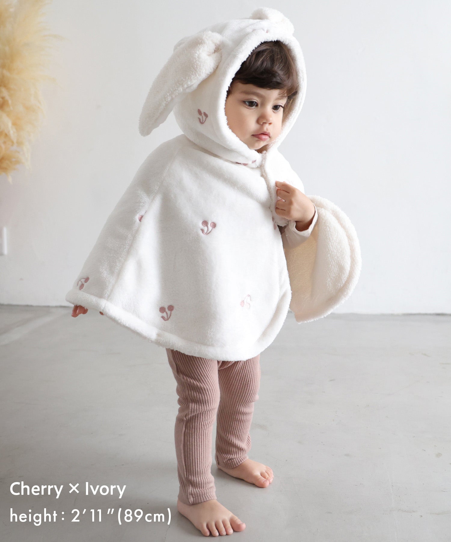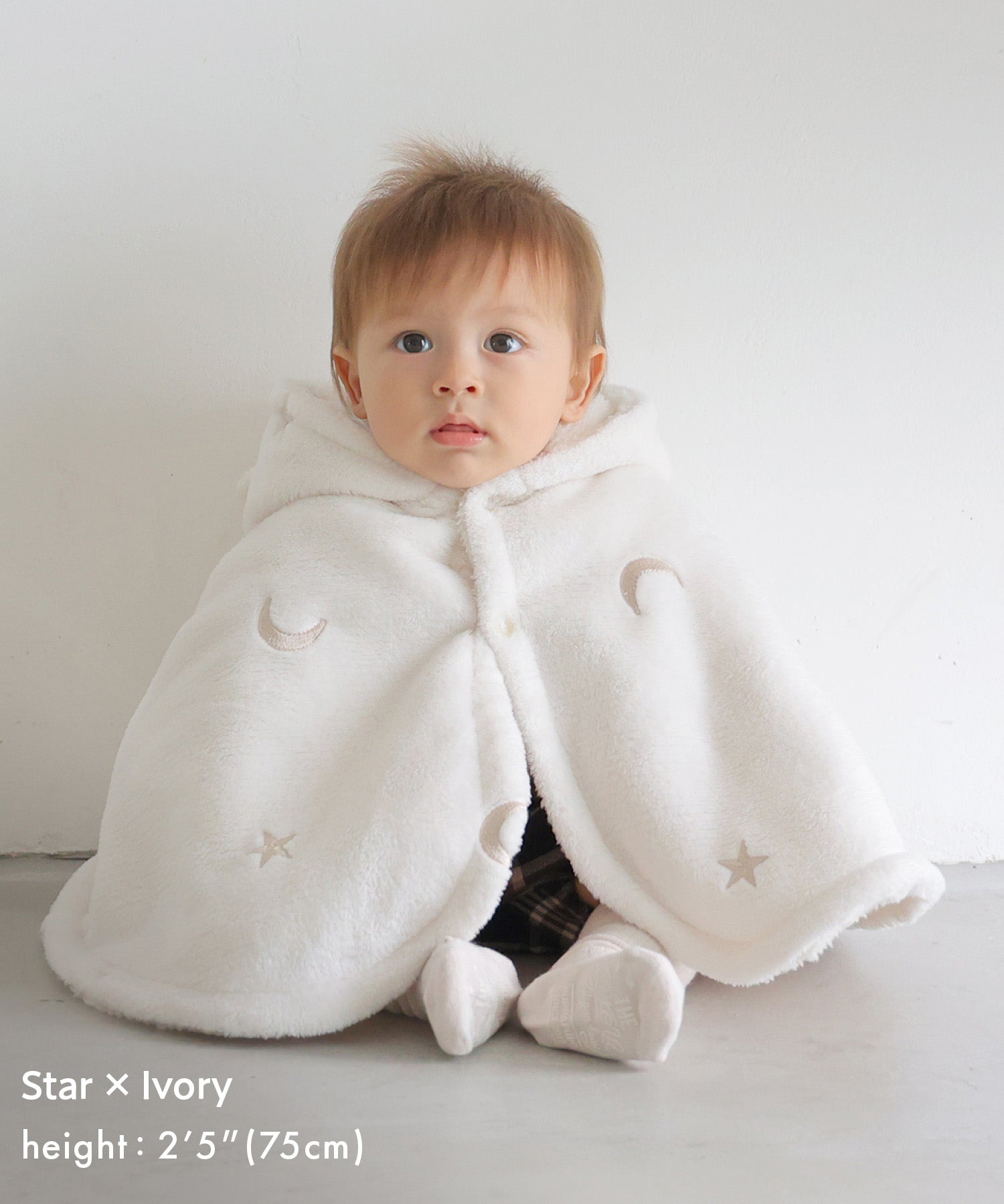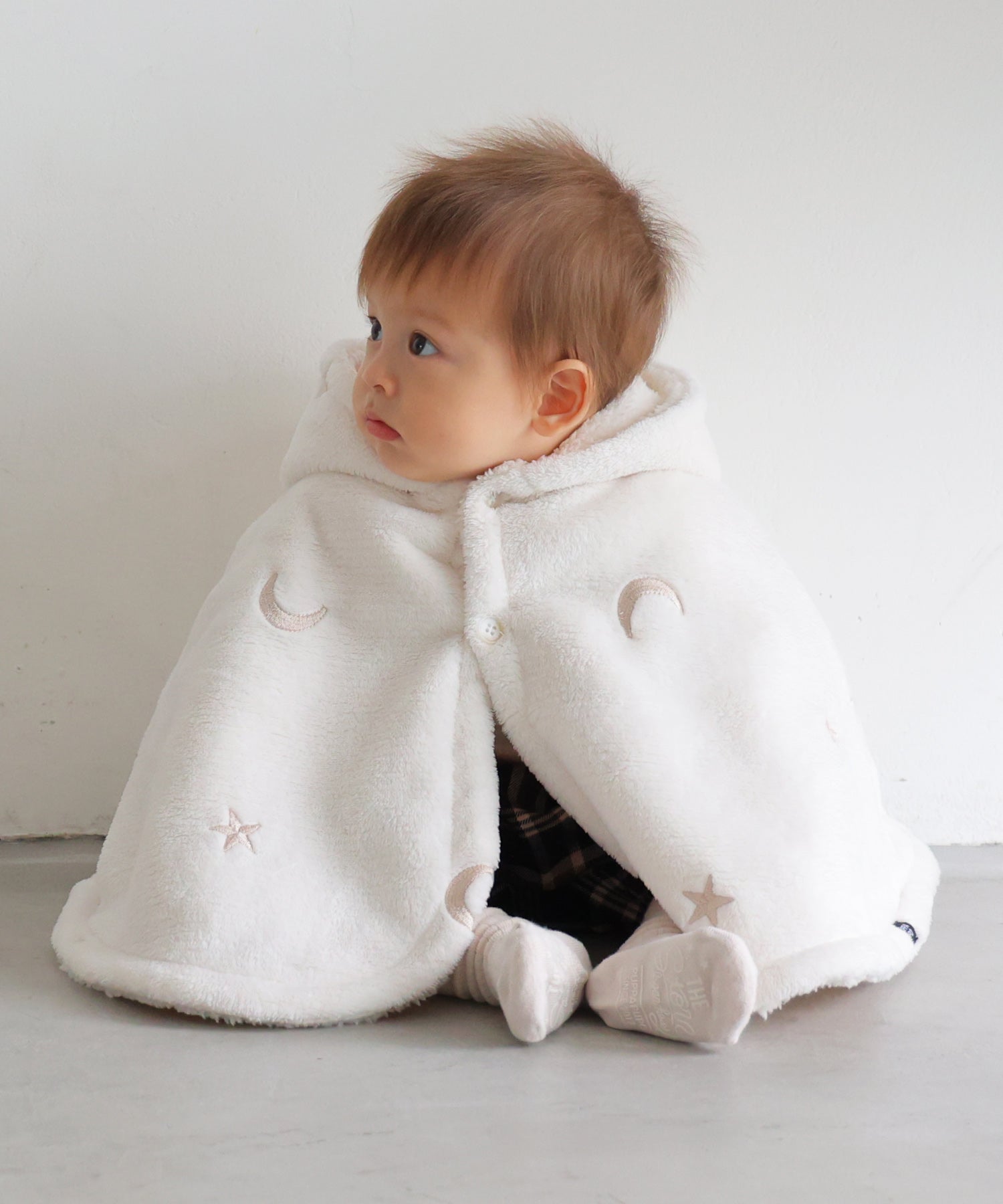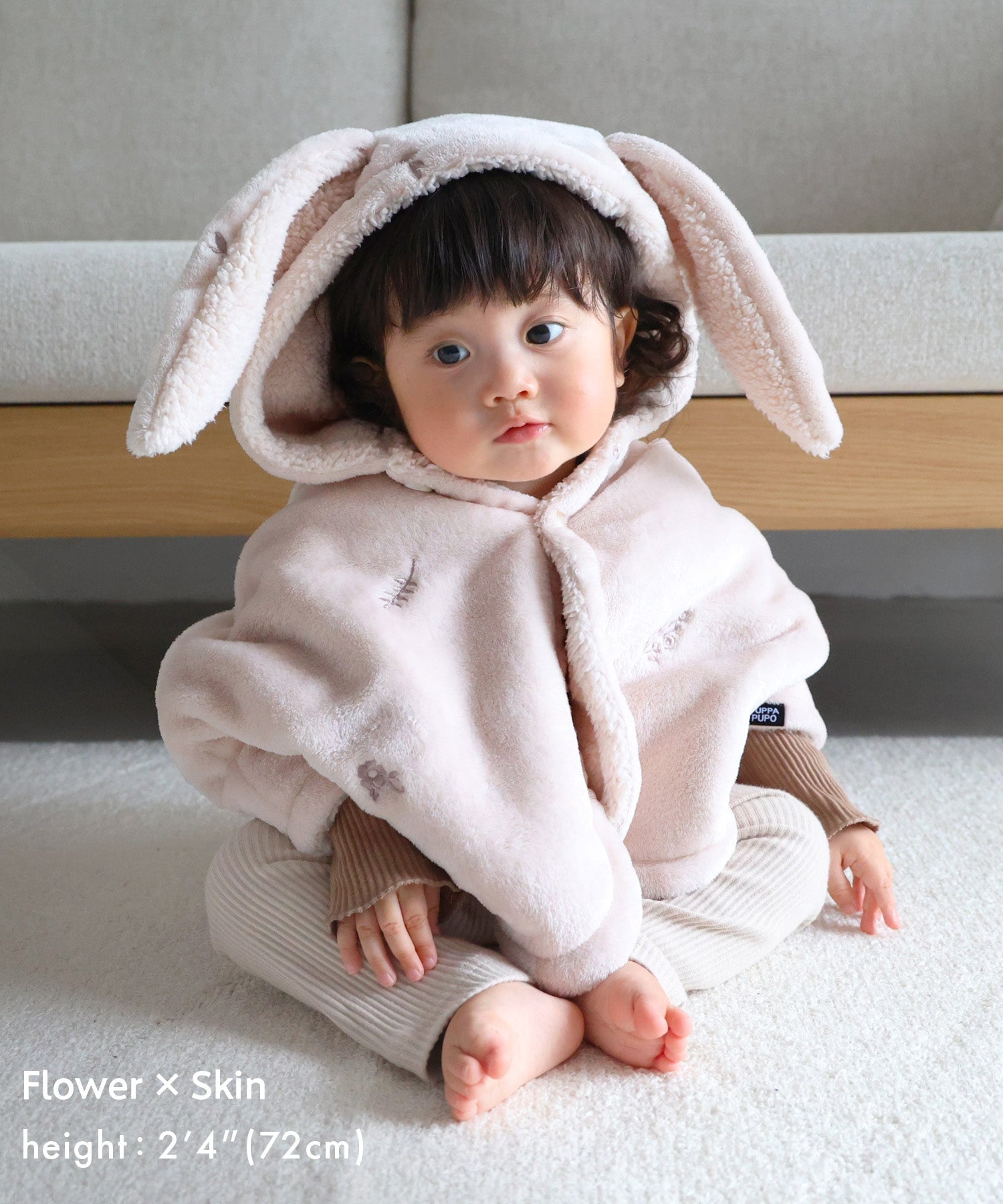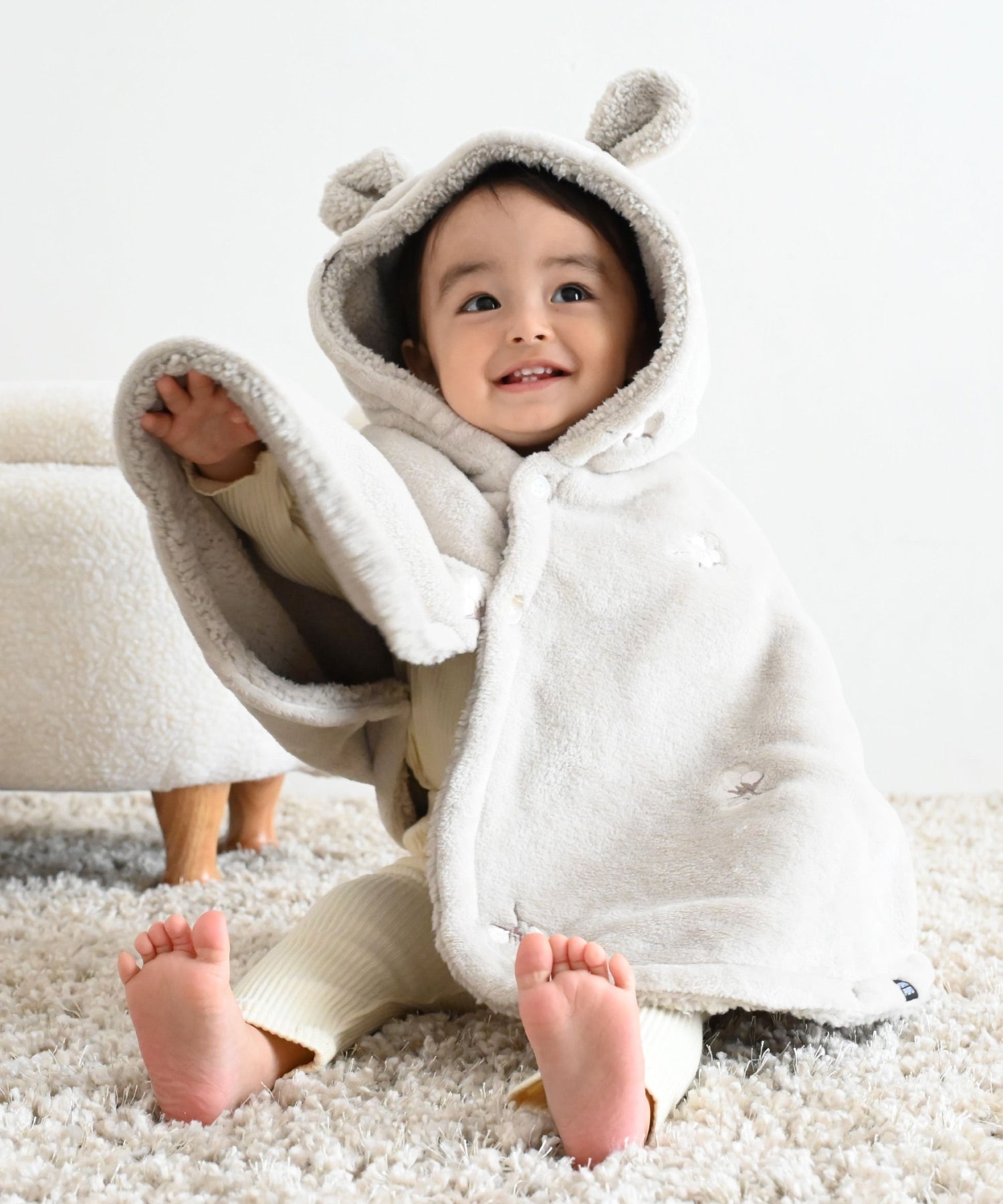 A versatile flannel poncho with a hood, perfect for indoor and outdoor use. The sleeves feature snap buttons, offering a 2-way option for with or without sleeves. Easy to throw on without using the sleeves, making it a quick and simple outer layer for short trips. Ideal for parks or outings during cold weather. The adorable hood with ear details adds a cute touch.