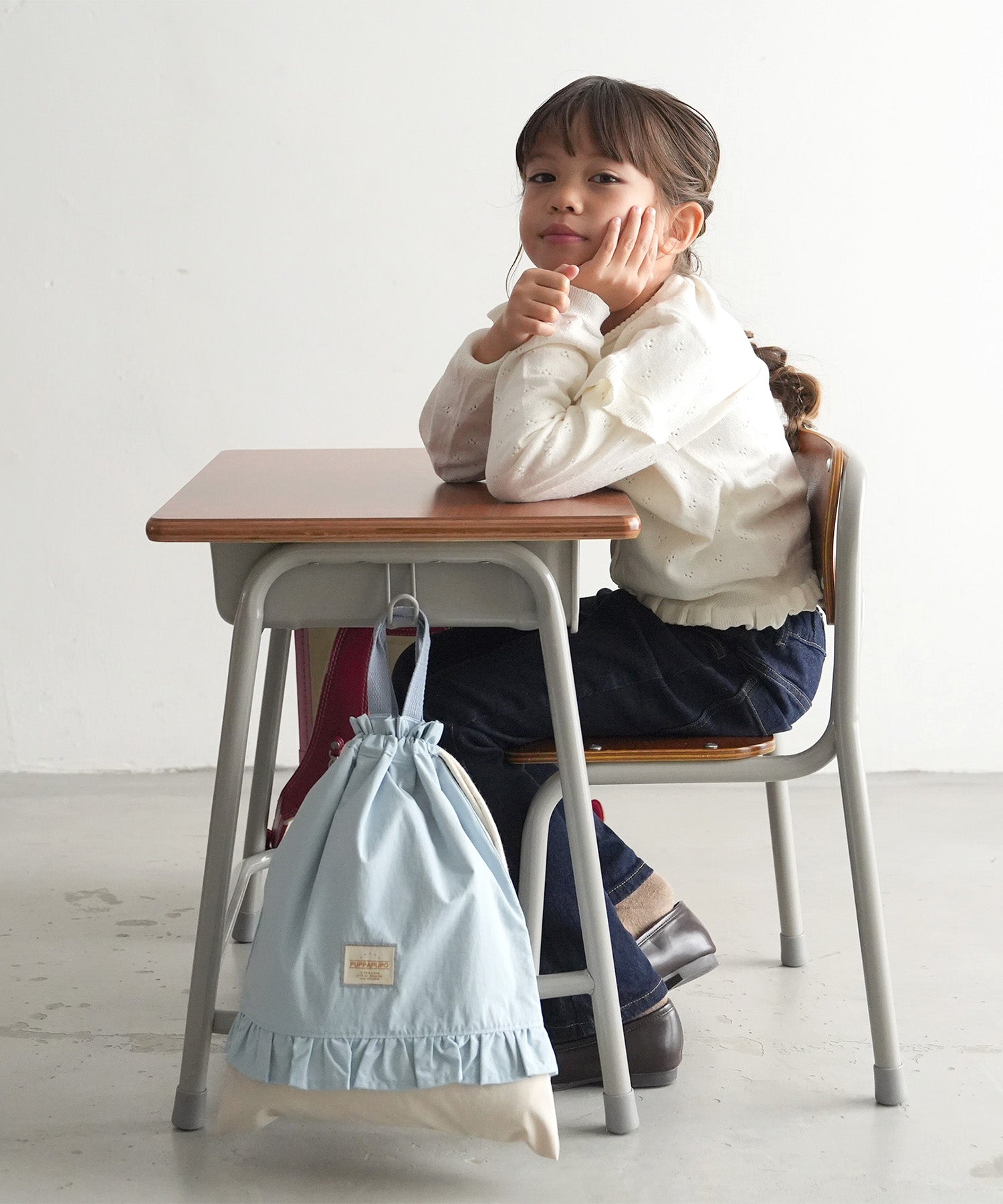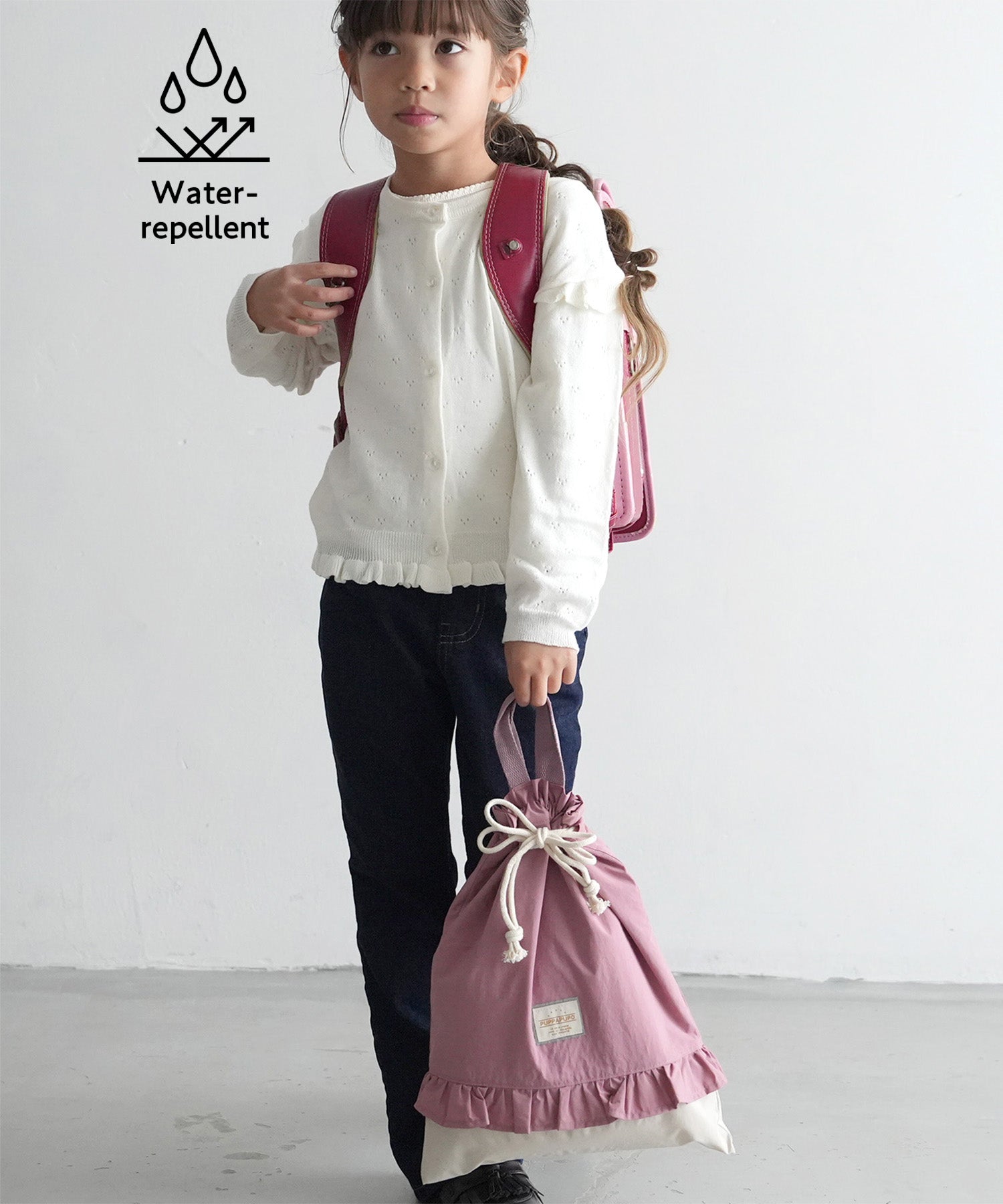A cute two-tone, water-repellent functional drawstring bag. Its simple design means it can be used for years. Stylish enough for kids from little ones to upper elementary students.