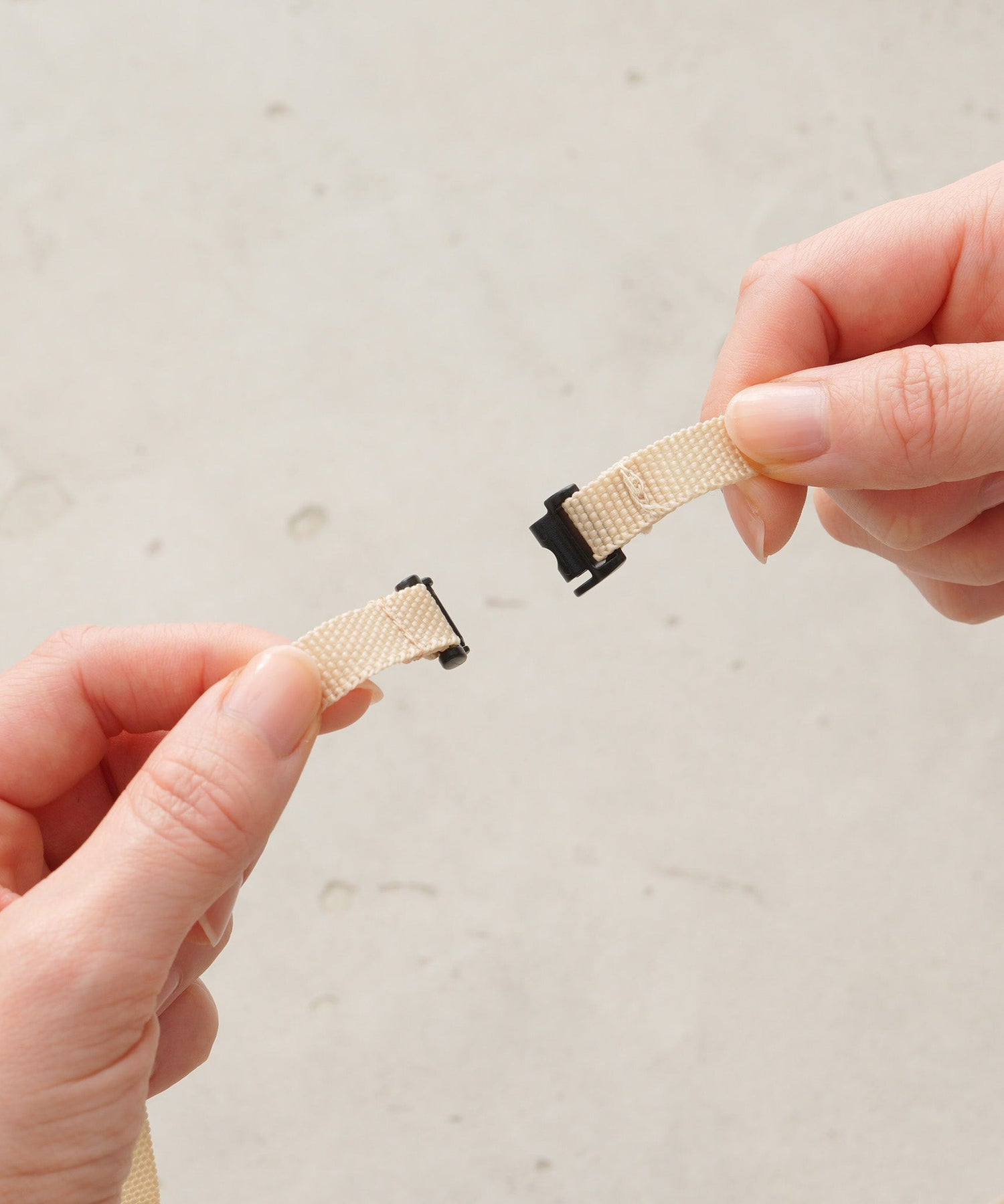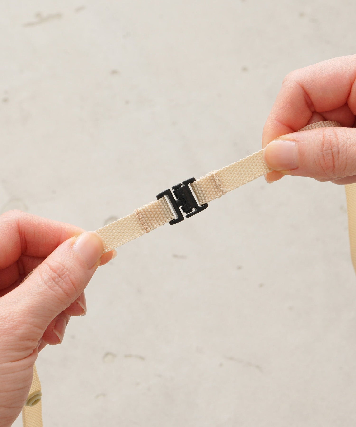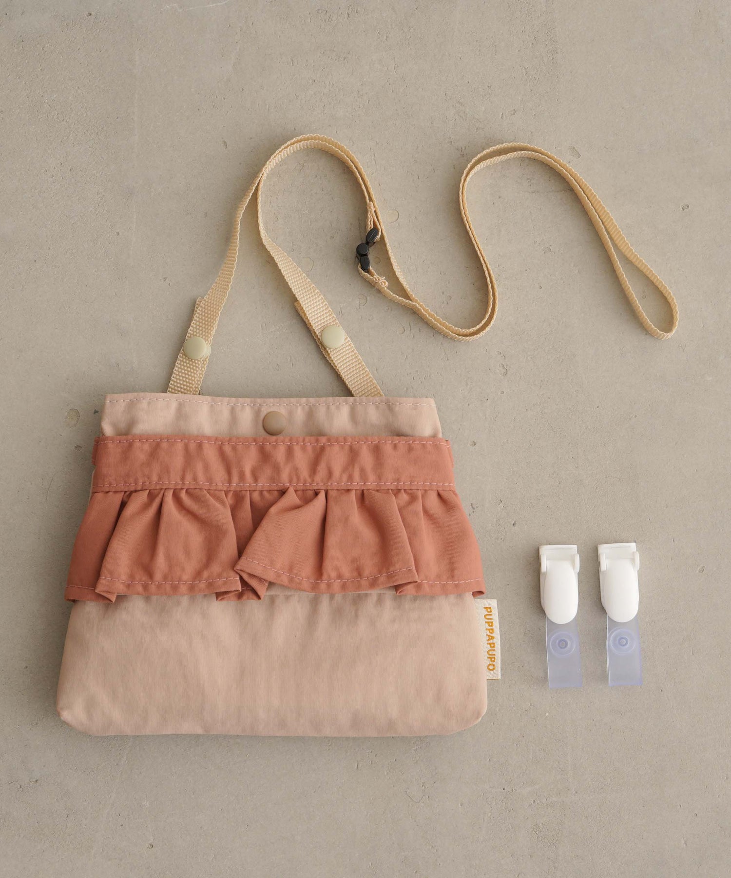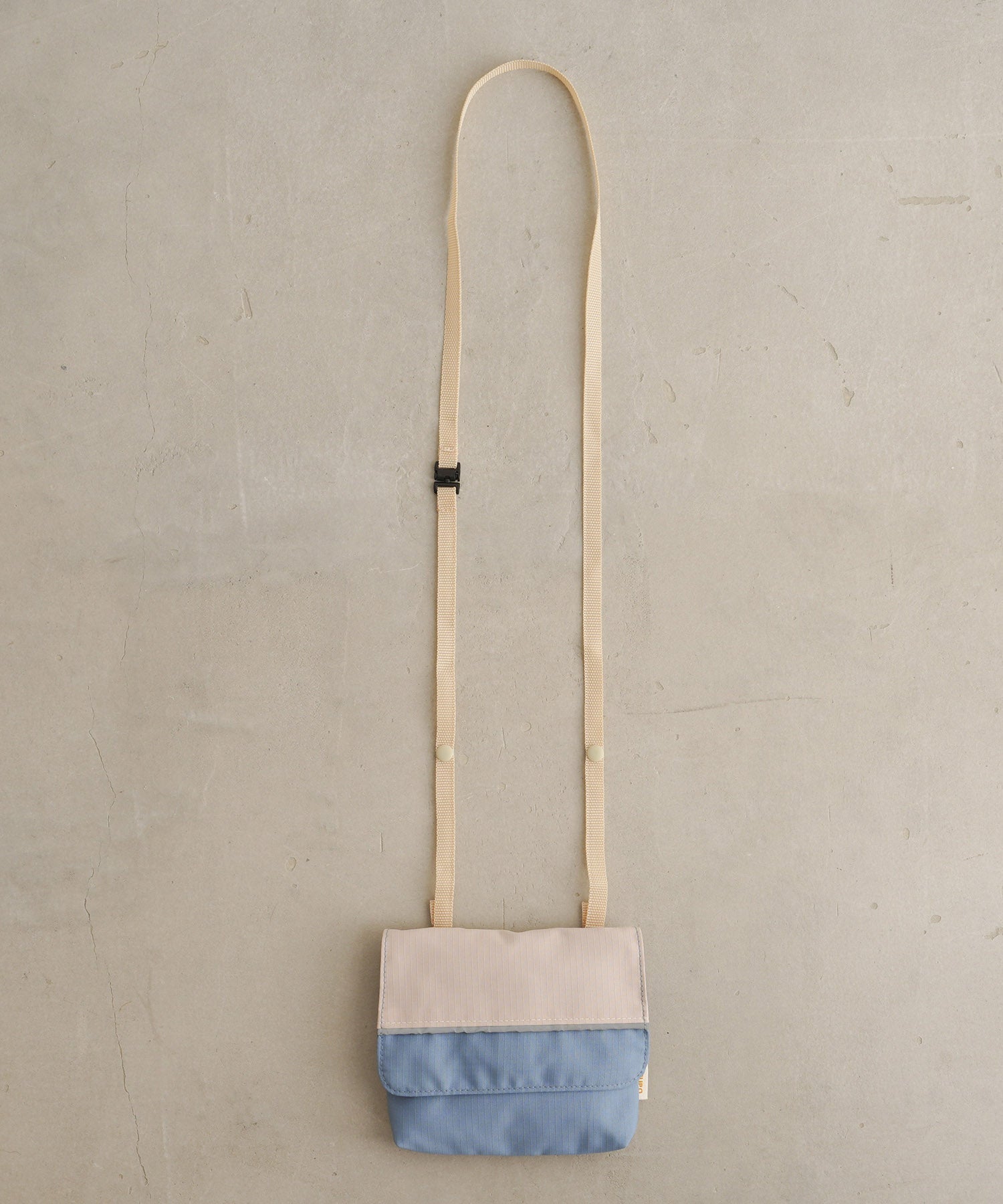 A clip-on mini pouch that attaches directly to bottoms like pants or skirts. The adjustable shoulder strap can be set to approx. 33.9″ (86cm) or 38.6″ (98cm) using the snap buttons, and features a safety release that detaches when pulled strongly. Both the hanging clips and the shoulder strap can be removed when not in use.