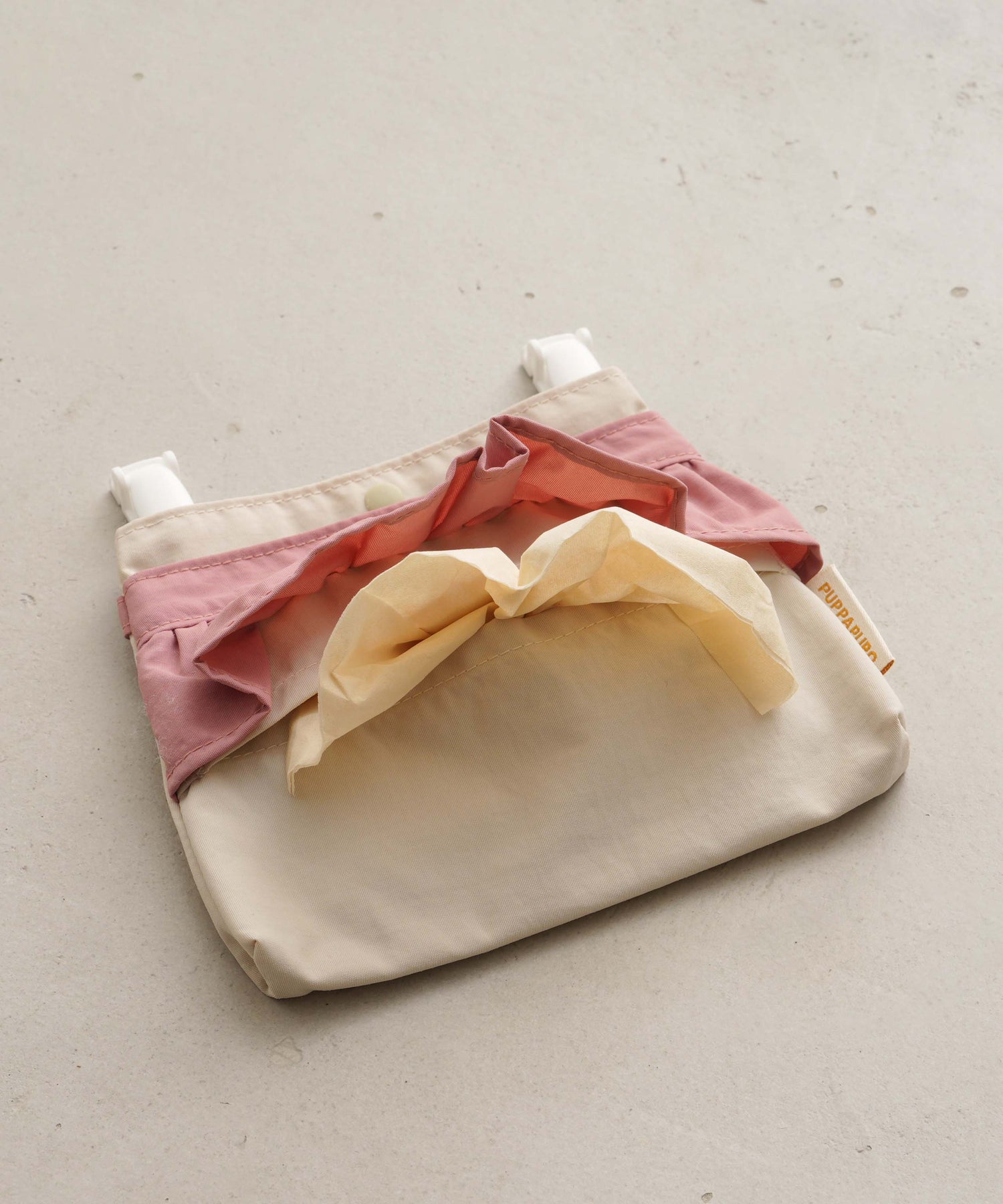 2 pockets hold items like a handkerchief, mask, or bandages, plus a built-in tissue case that fits standard pocket tissues (approx. 4.7″ × 3.1″ / 12×8cm). The structure varies by design: [Without frill] Main & sub pockets: cotton tape closure / Tissue case: back side | [With frill] Main pocket: snap button / Sub pocket: open style / Tissue case: front. *Photos show an 7.1″ × 7.1″ (18×18cm) mini handkerchief.