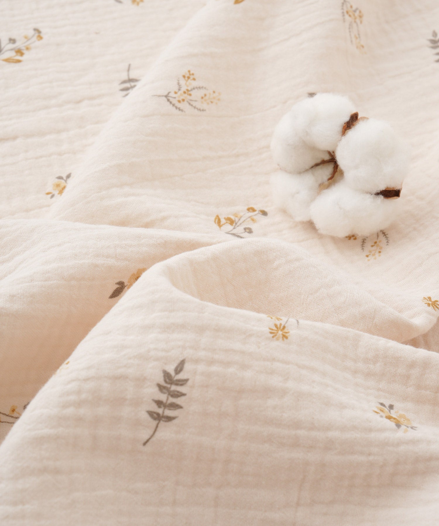 The fabric with a wrinkled textured look, paired with natural and subtly classic botanical patterns or Scandinavian-inspired designs, creates a stylish impression. Made from 100% cotton double gauze, it becomes softer and more textured with every wash.