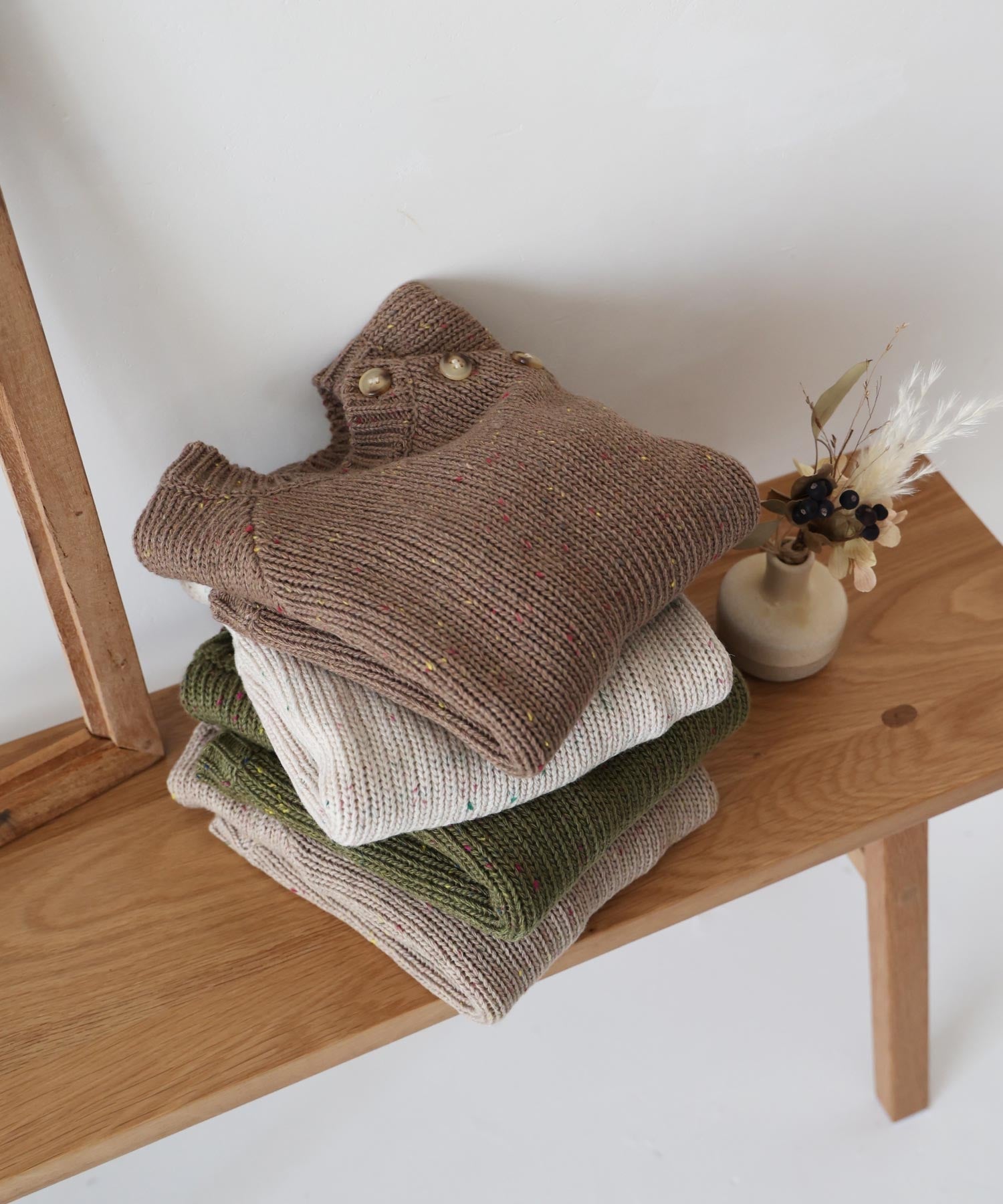 Please read the following important notes carefully before purchasing. 〇We recommend referring to the listed measurements and model wearing images, and comparing them with your usual size before making a purchase. 〇Please be aware that color transfer may occur due to friction during washing or wearing, pairing with light-colored items, exposure to rain or sweat, or during long-term storage. Take proper care to avoid this. 〇This product uses nep yarn. Due to the characteristics of the yarn, fuzz or pills may transfer onto layered clothing. Additionally, neps may gradually come off through wear and washing. 〇Pilling and fuzzing may occur due to friction during wear or washing. Please handle with care. If pilling occurs, please remove it using a fabric shaver. 〇Take care to avoid snagging the yarn on belts, bags, accessories, or other items. 〇Be careful not to lean against rough walls or snag the yarn on protruding objects. 〇After washing, do not wring strongly. Reshape the garment and dry flat in the shadev.〇Since this product is packaged immediately after production, it may have a slight odor when first opened. Washing will help reduce the smell.