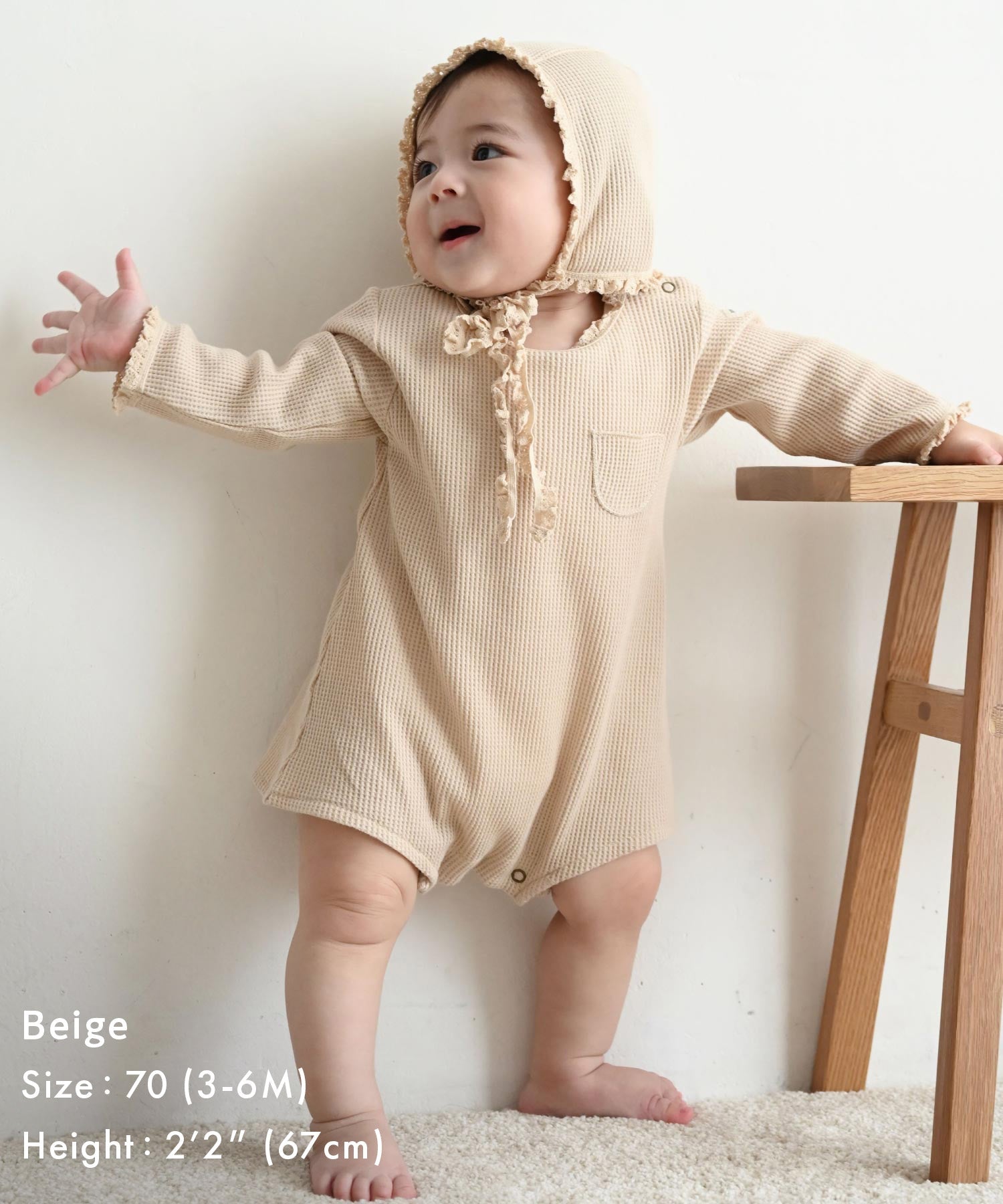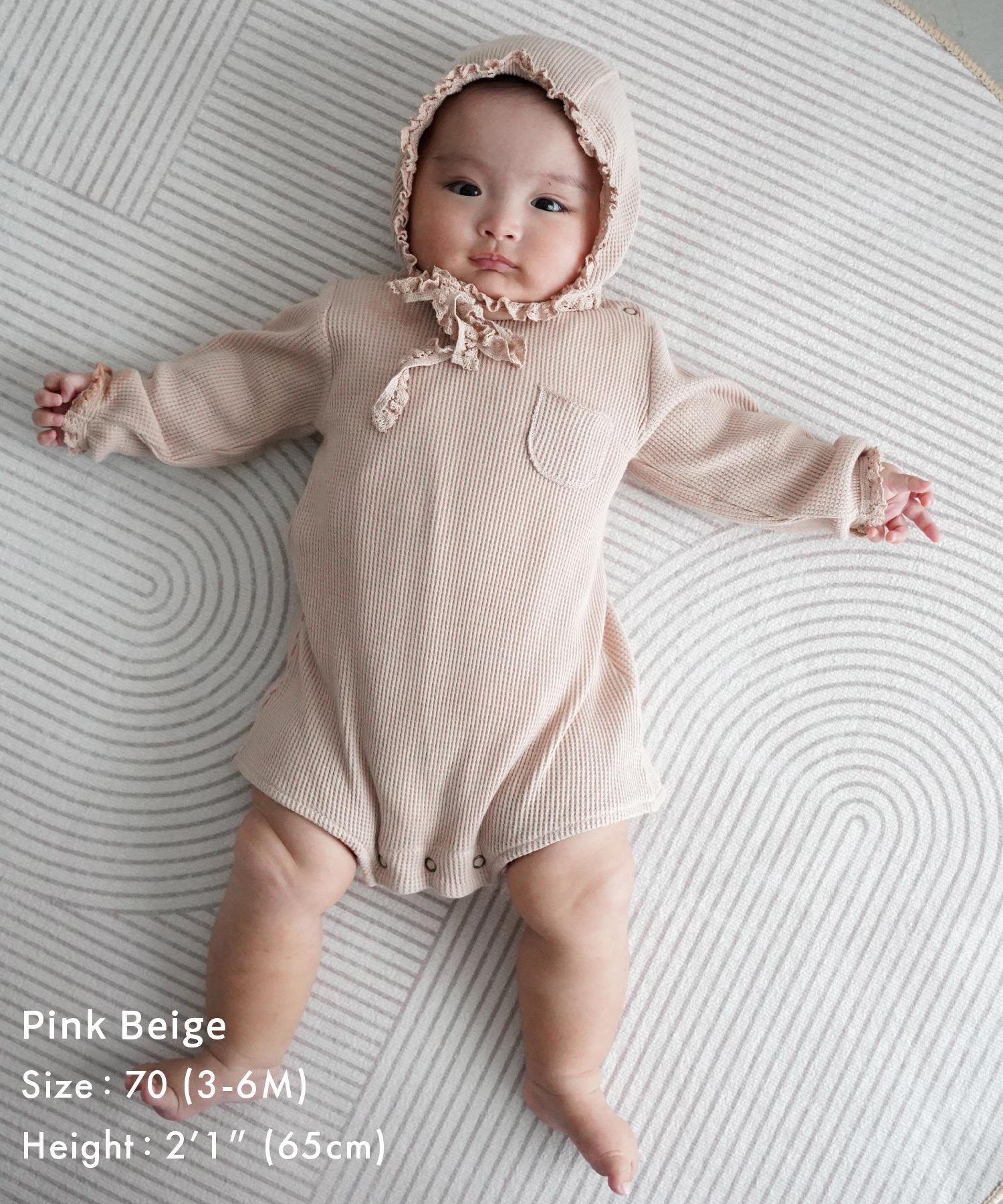 • A 2-piece set featuring a romper and a matching bonnet made from the same fabric and design. The bonnet is perfect for outings or at-home photoshoots, adding a cute touch. It also covers the ears completely, making it great for a bit of extra warmth.
