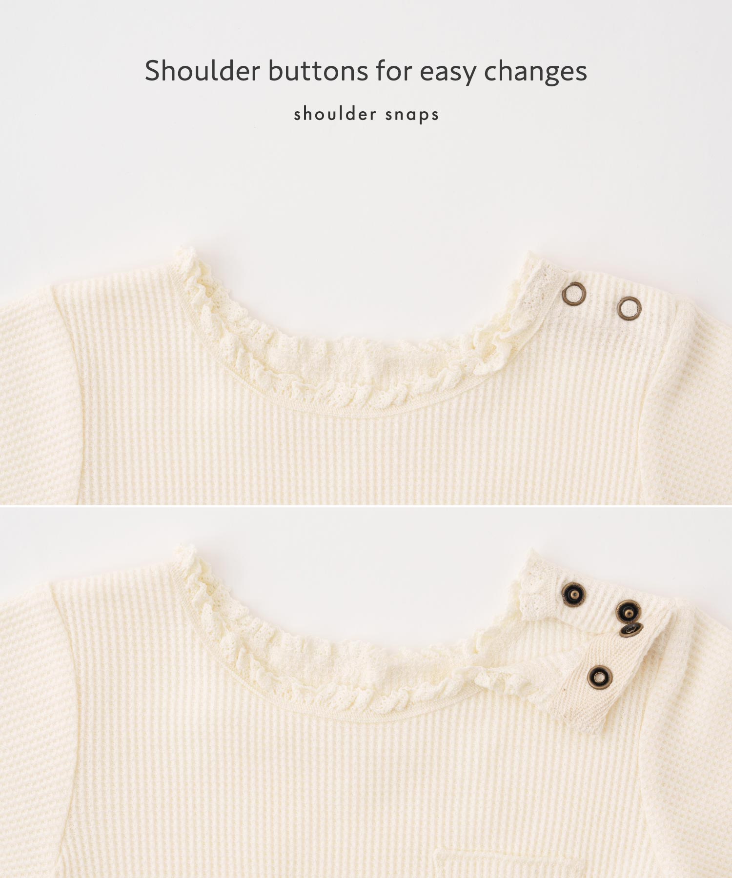 • The shoulders feature snap buttons, making it easy to dress your child even with pull-over styles by opening the buttons. This helps prevent stretching around the neckline and allows for smooth outfit changes. This design is recommended for baby and kids’ clothing that require frequent changing.