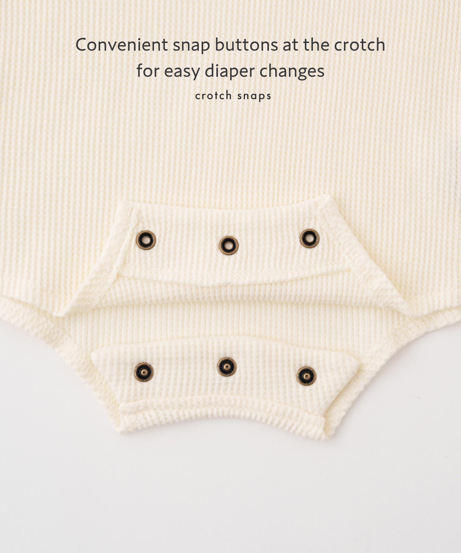 • An essential feature for baby clothing is making diaper changes and outfit swaps as easy as possible. One common struggle during the fall and winter—when rompers are often worn over an undershirt—is dealing with two layers of snap buttons around the diaper area. To minimize the hassle while keeping a clean and stylish look, the design uses just three snaps.