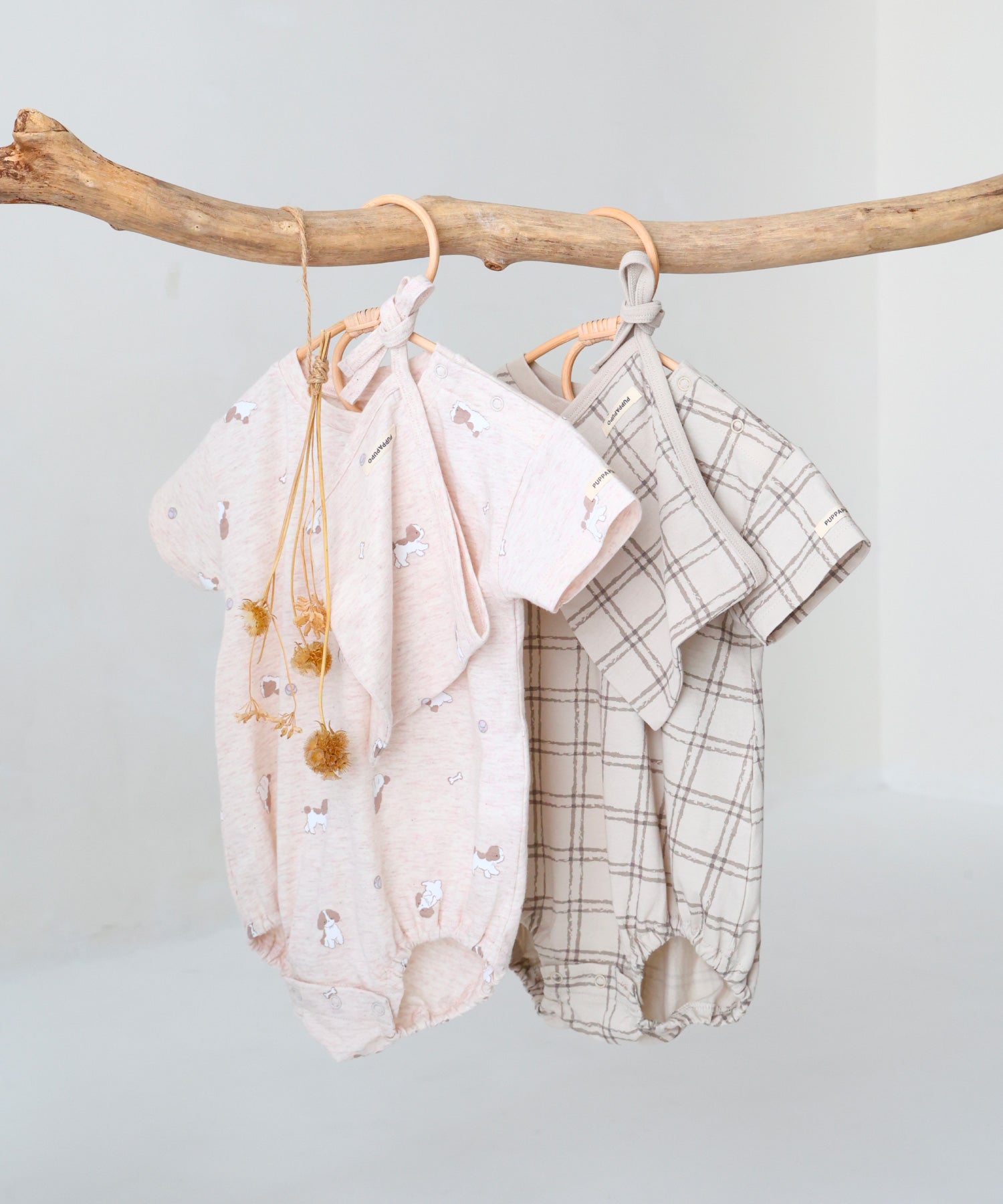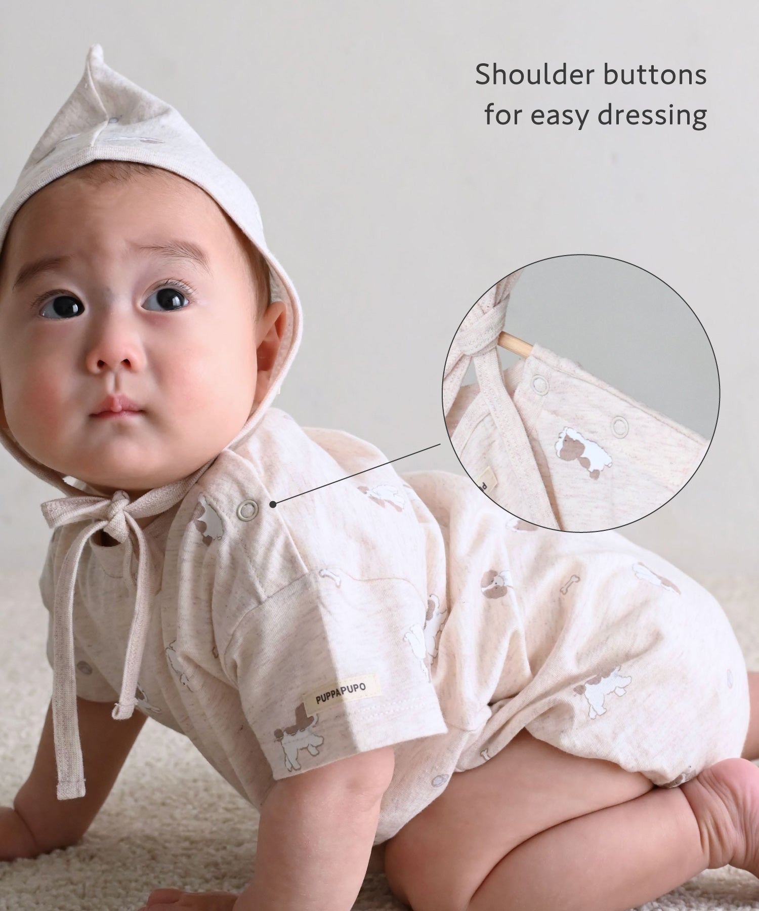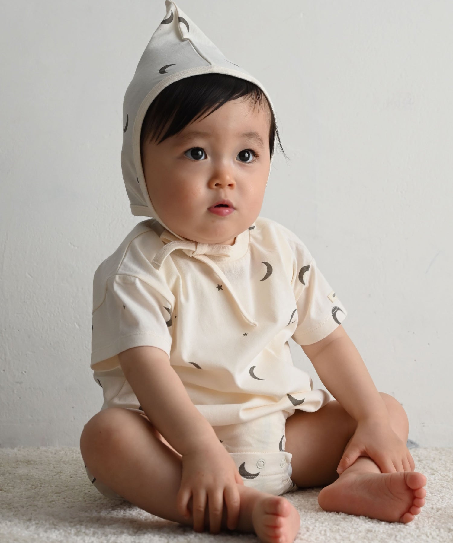 [Rompers] Main body: 100% cotton; Rib: 95% cotton, 5% polyurethane. [Bonnet] Main body: 100% cotton; Rib: 95% cotton, 5% polyurethane.
