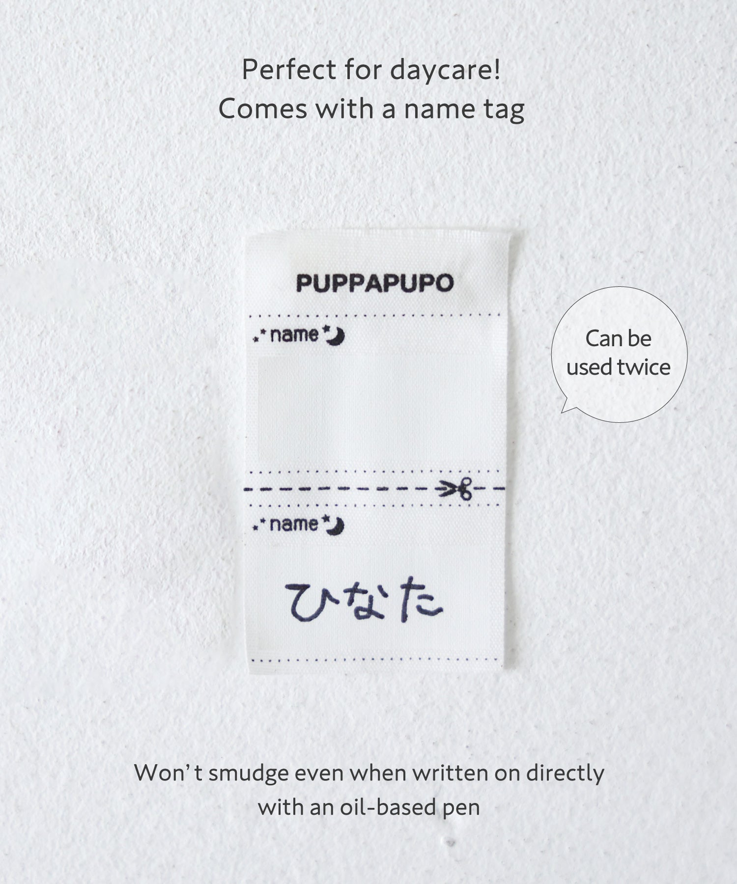 • At daycare and preschool, it's standard to label all belongings—including clothing—as part of the entrance preparation, according to enrollment guidelines. PUPPAPUPO’s name tag makes labeling easy: it’s designed to resist smudging even when written on with a permanent marker. Plus, the tag offers two writable sections, so when passing clothes down, simply cut off the used portion—no need for iron-on name labels.
