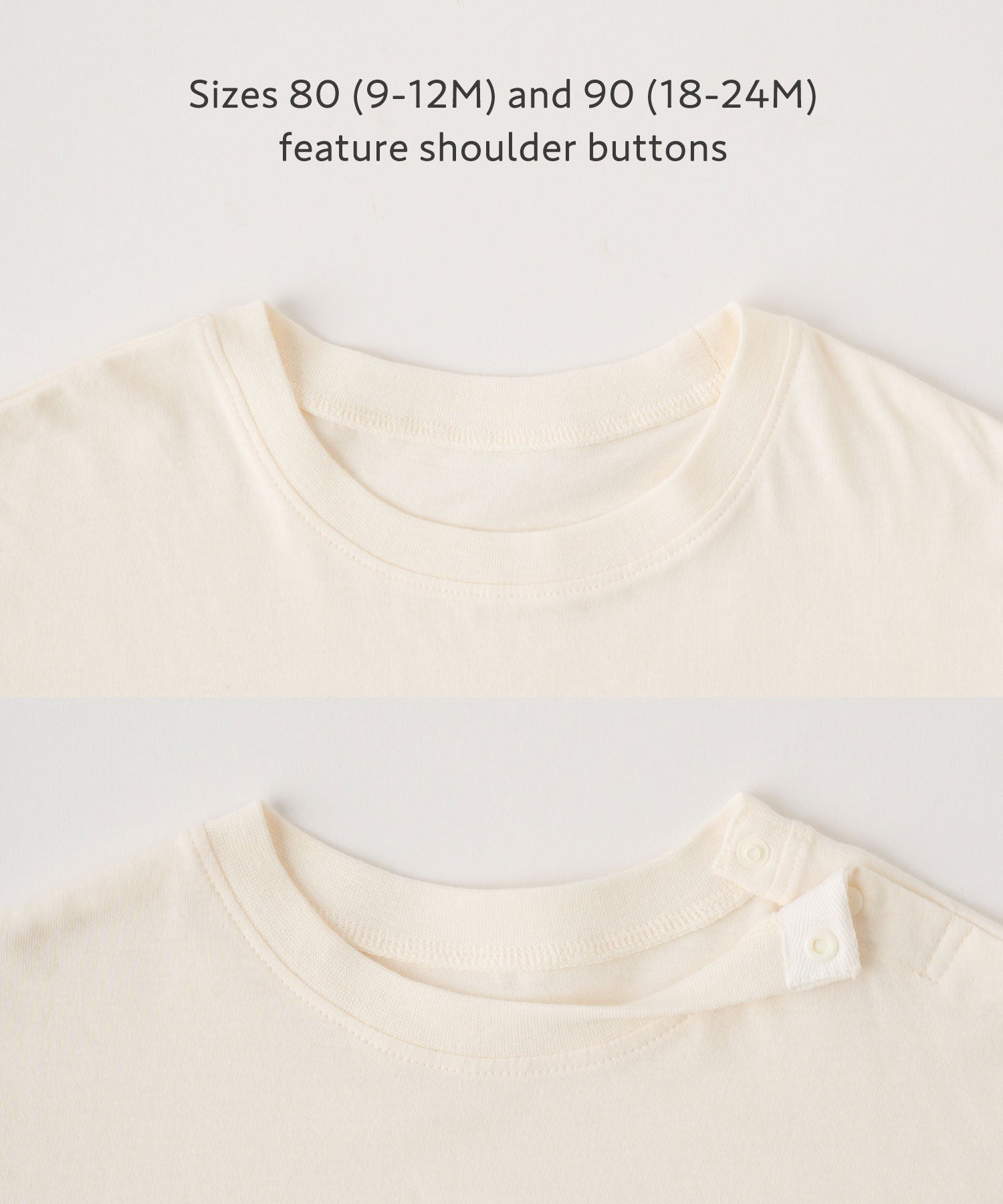 • Sizes 80 (9-12M) and 90 (18-24M) feature snap buttons at the shoulder, making it easy to put on and take off even with pull-over styles. This helps prevent stretching around the neckline and allows for smoother outfit changes. Ideal for baby and kids’ clothing, where frequent changing is a must.