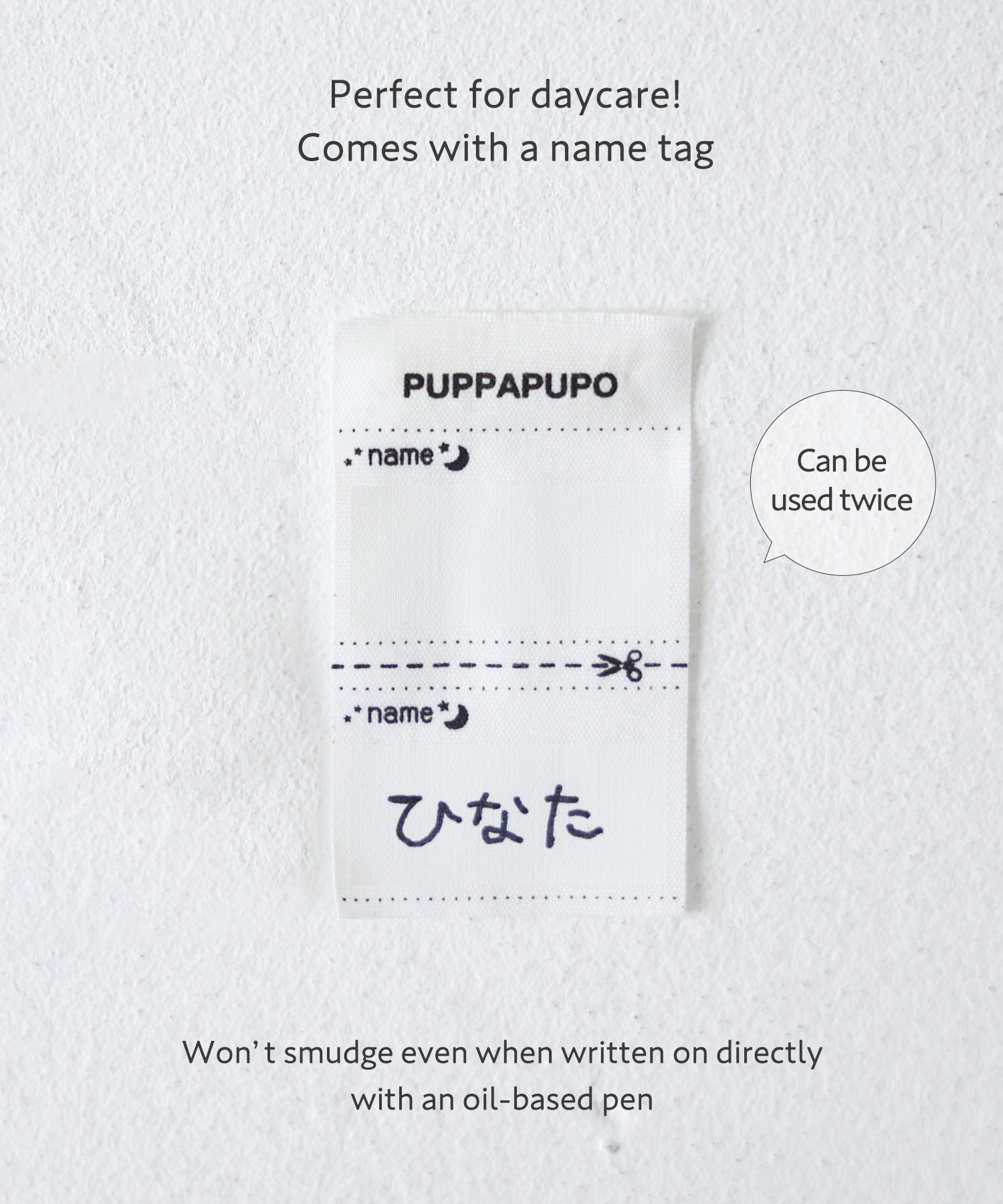 • PUPPAPUPO’s name tag resists smudging even when written on with an oil-based pen. The tag allows for two entries, so when passing it down, you can simply cut off the used portion. There’s no need to prepare separate iron-on name labels.