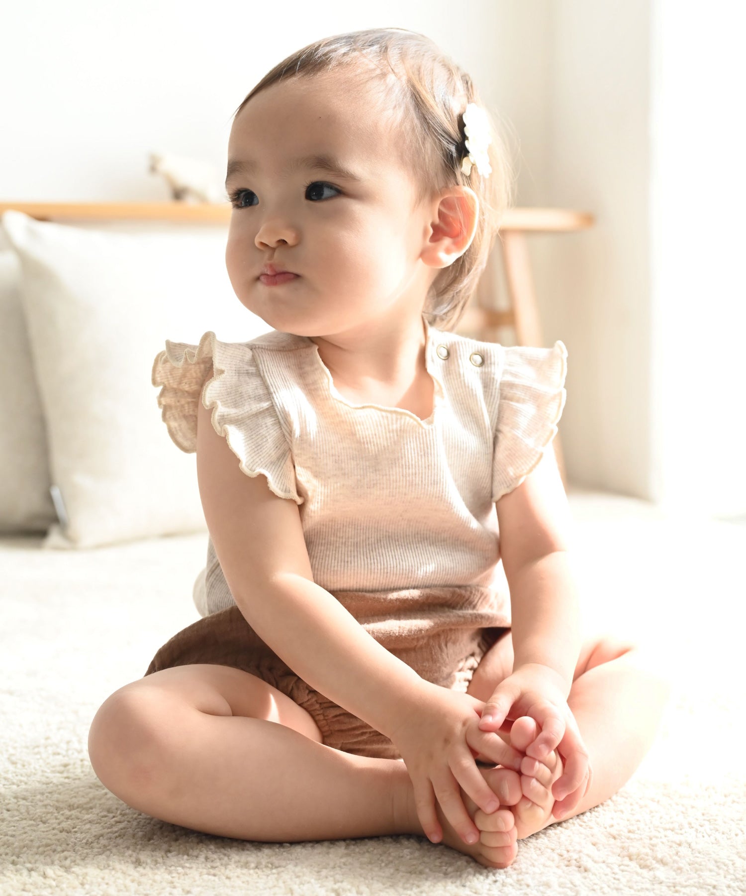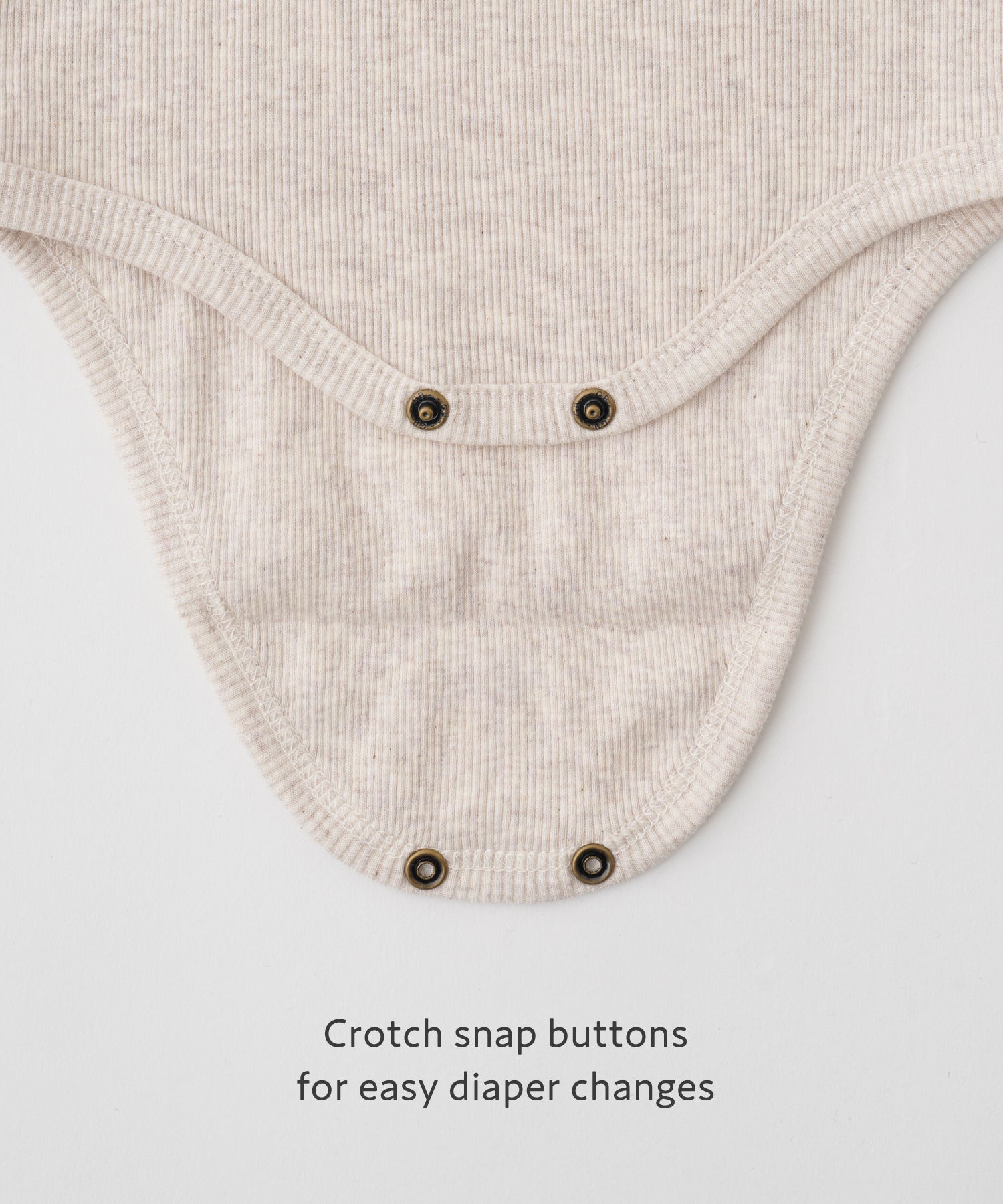 • A must-have feature for baby clothing is ease of diaper changes and dressing. To address the “double-snap” issue—common when rompers are worn over a onesie and require fastening two layers of crotch snaps—we designed this romper with just two snaps. This keeps diaper changes simple while maintaining a neat, tidy appearance.
