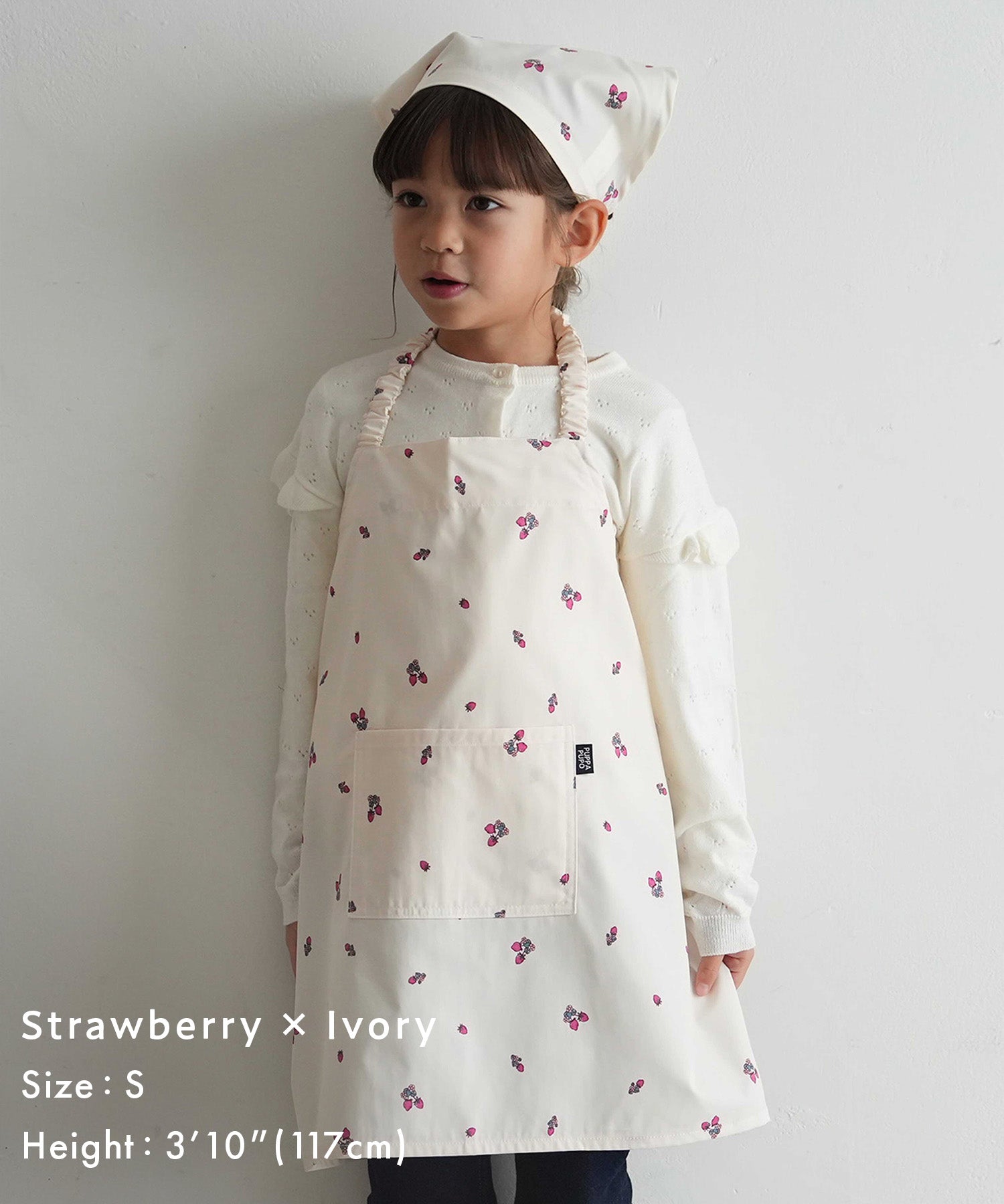 [S] Apron: Approx. 23.6″(60cm) width × 20.9″(53cm) length, Triangle head scarf: Fits head circumference 19.7″ (50cm) and up (suitable for sizes 100-120 (3T to 5-6T)); [M] Apron: Approx. 27.6″ (70cm) width × 24.8″ (63cm) length, Triangle head scarf: Fits head circumference 21.3″ (54cm) and up (suitable for sizes 130 -150 (7T to 12T)); [Bag – common size]: Approx. 9.1″ × 10.2″ (23×26cm) (excluding handles)
