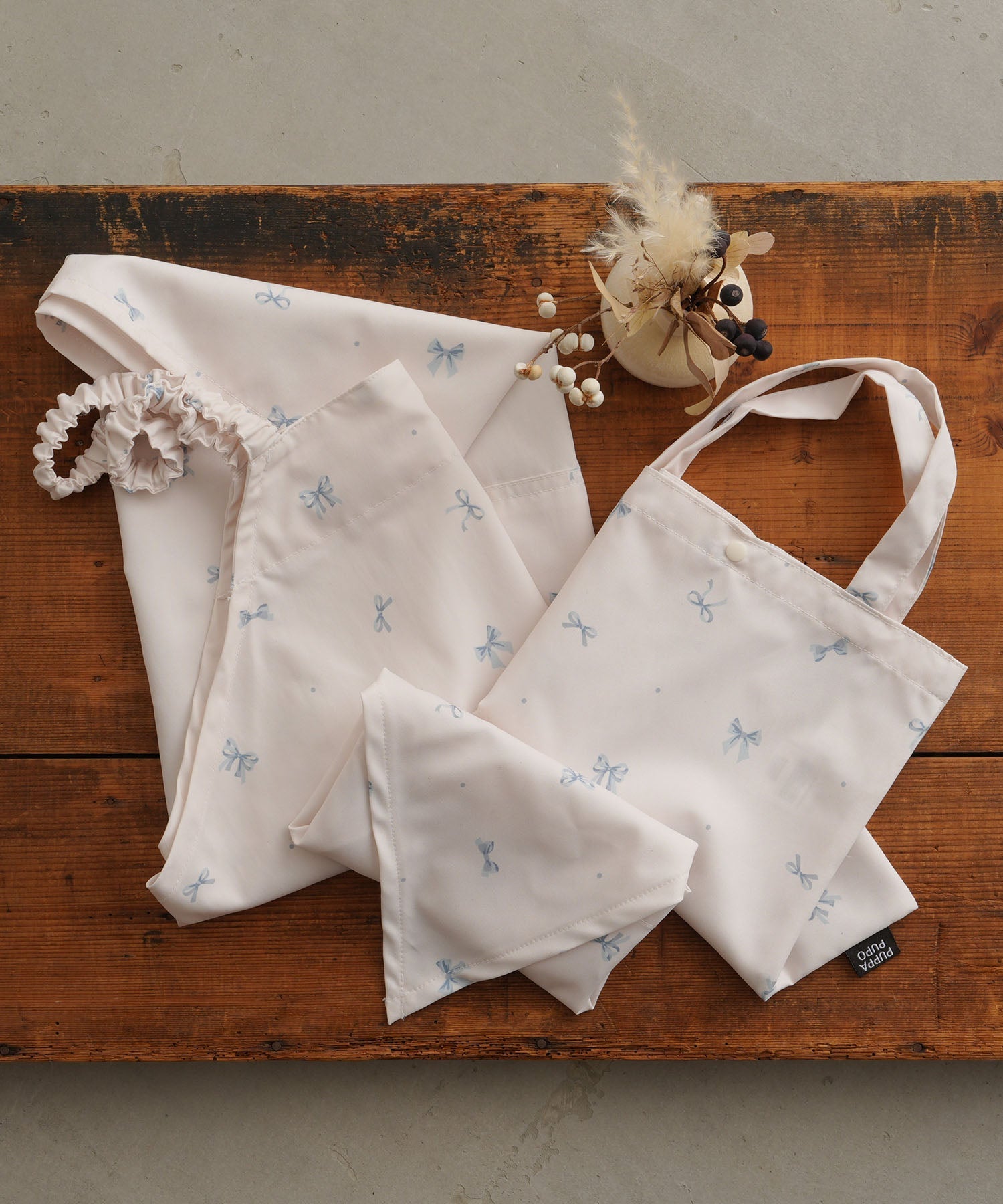 Three-piece set includes an apron, triangle head scarf, and dedicated bag for kids. The apron, which is easy to put on and take off, features a water-repellent surface and can be worn simply by slipping it on. It comes in stylish muted colors, like choosing an outfit, and has a cute design with natural motif illustrations.
