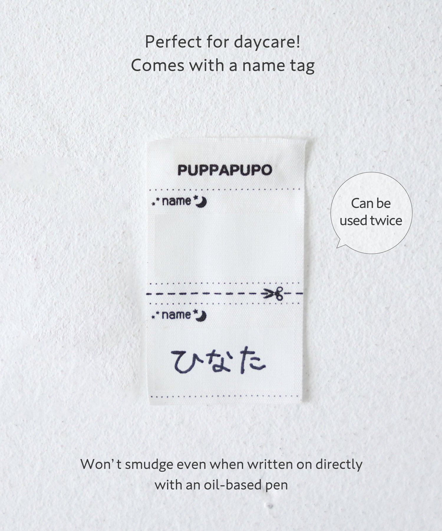 • At daycare and preschool, it's standard to label all belongings—including clothing—as part of the entrance preparation, according to enrollment guidelines. PUPPAPUPO’s name tag makes labeling easy: it’s designed to resist smudging even when written on with a permanent marker. Plus, the tag offers two writable sections, so when passing clothes down, simply cut off the used portion—no need for iron-on name labels.