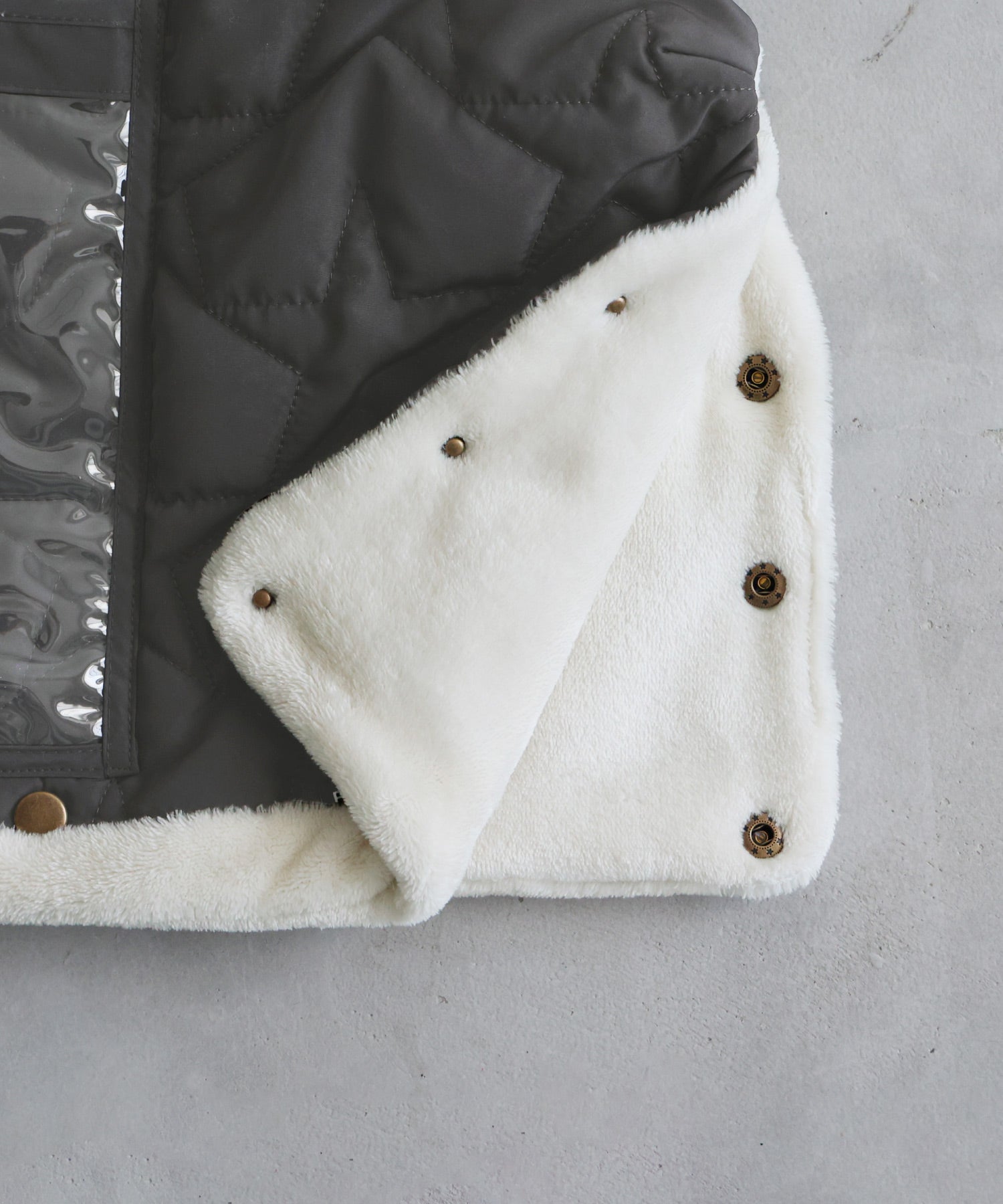 Outer fabric (quilted): 100% polyester (Pocket part: Vinyl chloride) Filling: 100% polyester Lining: 87% polyester, 13% rayon