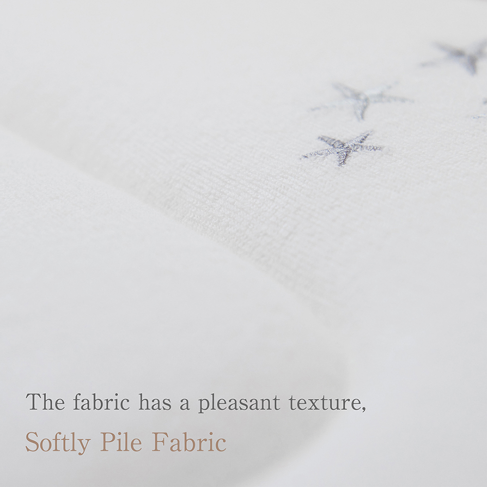 ผ้าขนปุยเนื้อนุ่มของวัสดุด้านนอกทำจากผ้าฝ้าย 100% ที่อ่อนโยน พร้อมการปักลายดาวเล็กๆ บริเวณส่วนศีรษะ