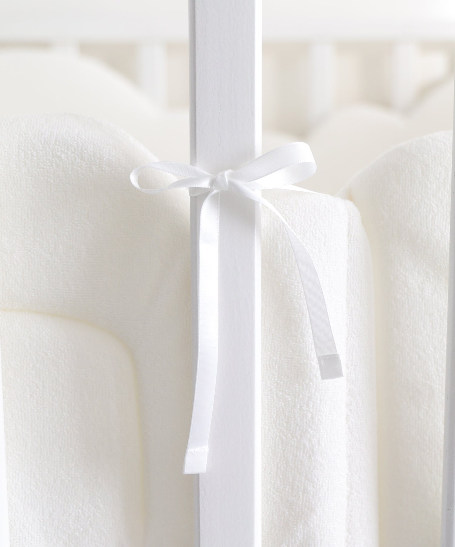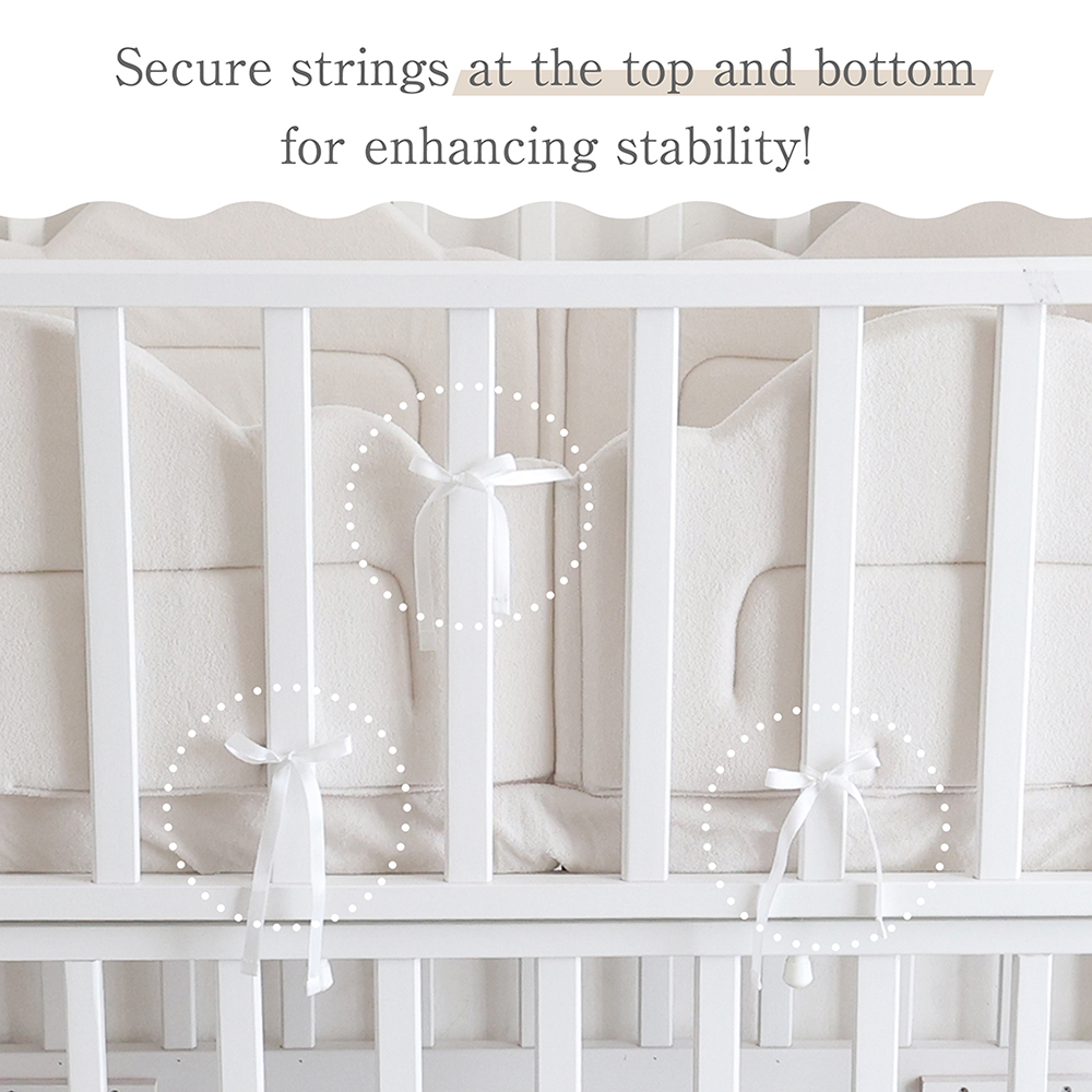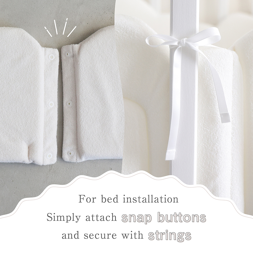 • ติดกระดุมแป๊กและผูกด้วยเชือกเพื่อการติดตั้งที่ง่ายดายบนเตียงเด็ก