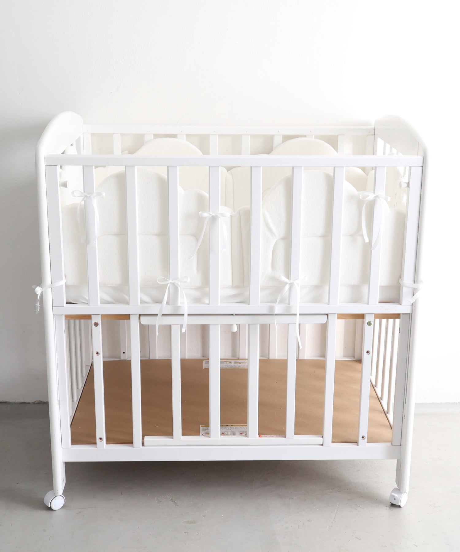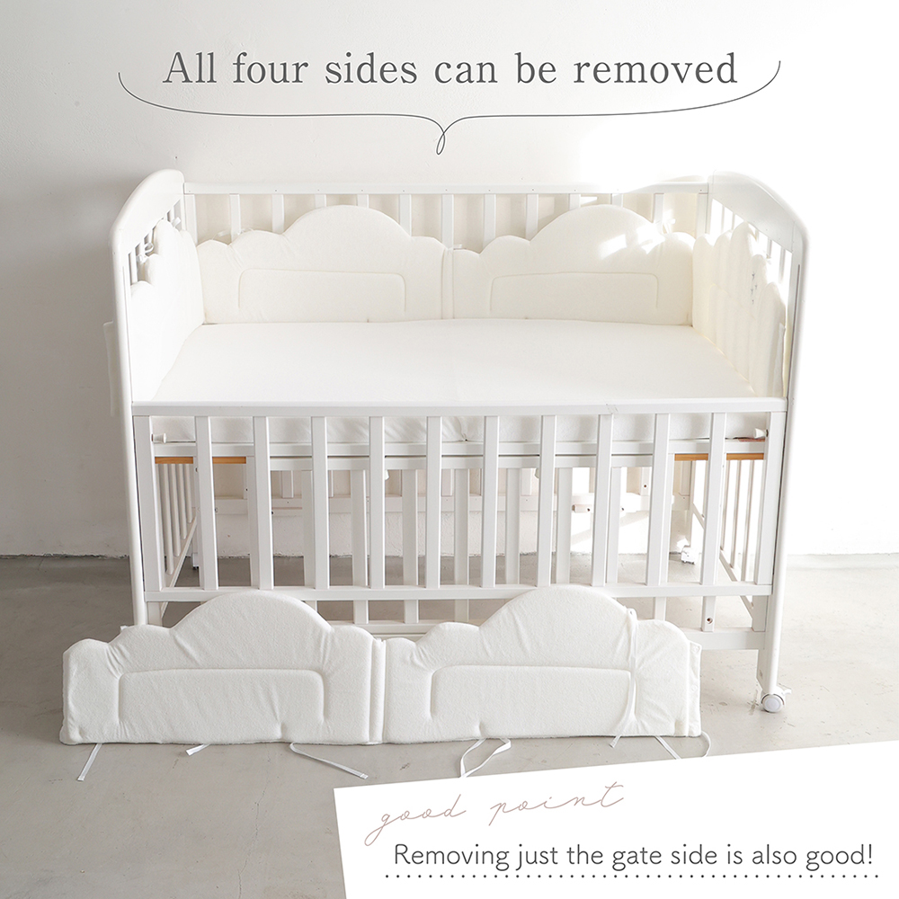 มุมทั้งสี่ได้รับการออกแบบให้ถอดออกได้ด้วยกระดุมแป๊ก ตัวอย่างเช่น หากคุณต้องการดูแลทารกโดยการเปิดราวเตียงด้านบนหรือด้านล่าง คุณสามารถถอดเฉพาะแผ่นกันกระแทกที่หันไปทางด้านนั้นออกได้