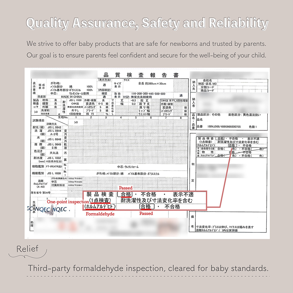 เราต้องการให้สินค้าสำหรับเด็กของเราปลอดภัยสำหรับทารกแรกเกิด และเราต้องการให้คุณแม่รู้สึกมั่นใจในการเลือก เพราะลูกๆ ของพวกเขาจะได้ใช้สินค้าเหล่านี้ ผลิตภัณฑ์ของเราผ่านการทดสอบหลายครั้ง (การตรวจสอบผลิตภัณฑ์ การทดสอบการซัก และการตรวจสอบผ้า) โดยองค์กรภายนอก