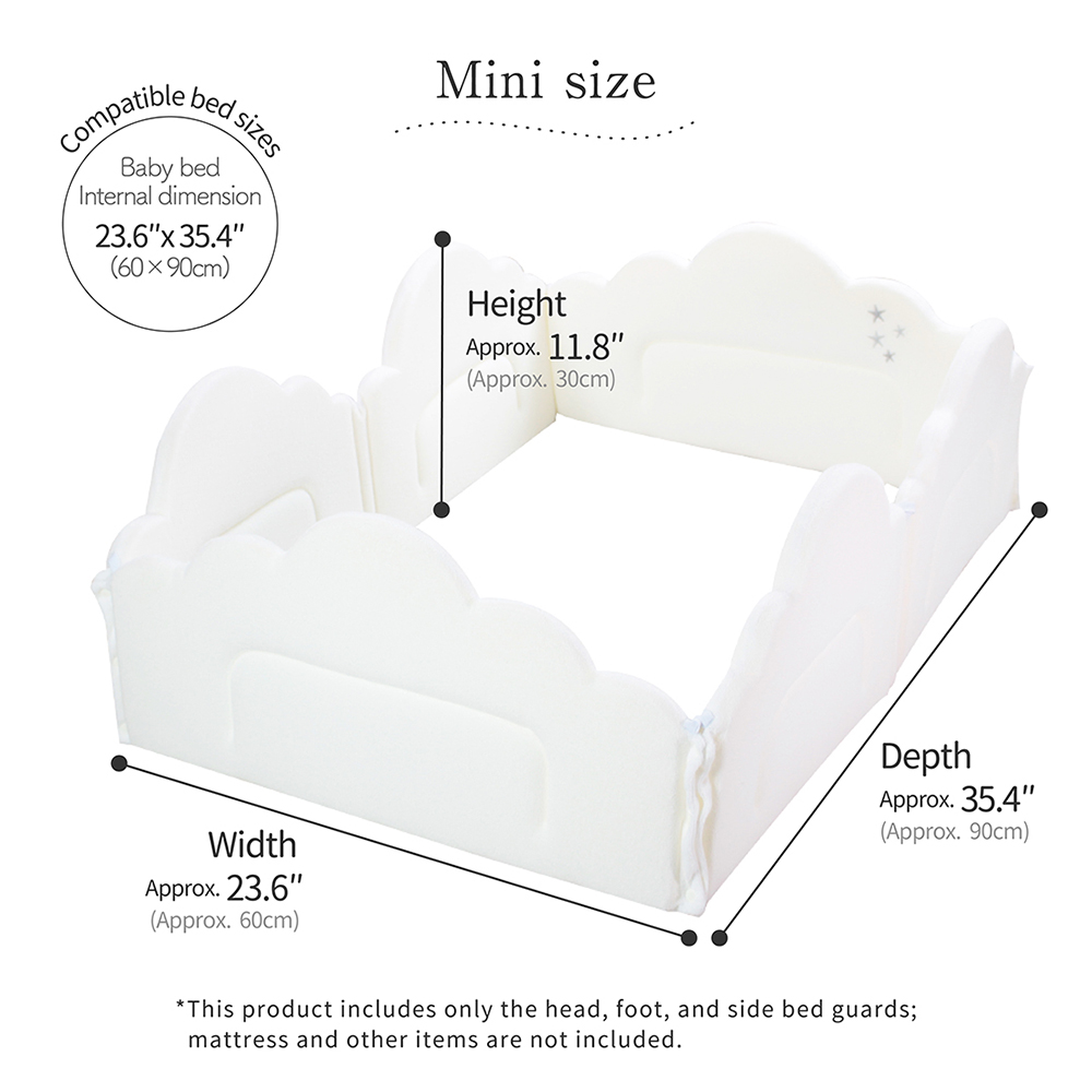คุณสามารถเลือกได้สองขนาด: [ปกติ] สำหรับขนาดเตียงเด็กภายใน 27.6" × 47.2" (70x120 ซม.) และ [มินิ] สำหรับขนาดเตียงเด็กภายใน 23.6" × 35.4" (60x90 ซม.) ทั้งสองขนาดพอดีกับเตียงเด็กอย่างสมบูรณ์แบบ