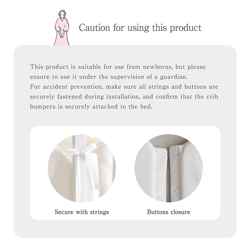 ผลิตภัณฑ์นี้เหมาะสำหรับทารกแรกเกิด แต่จำเป็นต้องใช้ภายใต้การดูแลของผู้ปกครอง เพื่อป้องกันอุบัติเหตุ ตรวจสอบให้แน่ใจว่าเชือกและกระดุมทั้งหมดถูกยึดอย่างแน่นหนาขณะติดตั้งผลิตภัณฑ์ นอกจากนี้ ตรวจสอบให้แน่ใจว่าแผ่นกันกระแทกเตียงเองถูกยึดเข้ากับเตียงเด็กอย่างแน่นหนา
