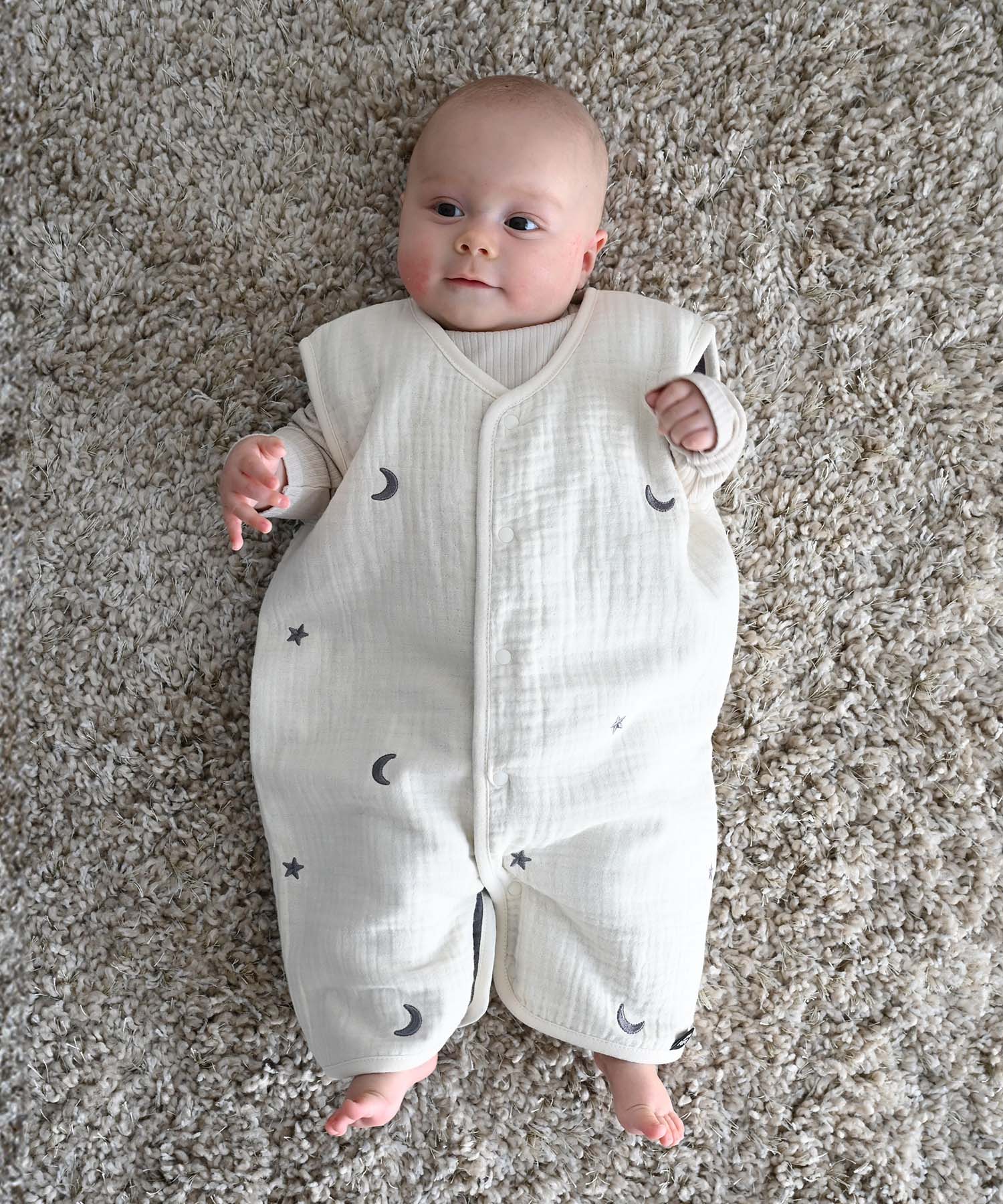 A baby wearable blanket suitable for use from the newborn stage. Often called a “wearable blanket,” it is perfect for keeping your baby warm during daily sleep. The front snap-button design makes it easy to put on while your baby is lying down, and diaper changes are simple and convenient. In addition, it features a 2-way design: coverall/pants style and dress/one-piece style, making it versatile for various occasions. Size guide: [S size] Recommended for kids up to 2'3" (70 cm) in height, reference clothing size 50-70 (0-6M)